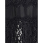 The long dress by Paco Rabanne combines elegance and sensuality through an intricate play of textures. Crafted from floral lace and ivory stretch viscose jersey, it embraces the silhouette with a fitted shape that enhances its natural lines. The high neck and long sleeves add a sophisticated touch, while scalloped hems and a central back slit bring fluidity and femininity. An iconic piece that embodies the bold yet refined spirit of the Maison.