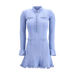 The pearl trim knit mini Dress by Self-Portrait blends softness and structure in a refined yet playful silhouette. Crafted in a stretch knit that gently sculpts the body, the design is illuminated by shimmering faux pearl trims that add a polished, jewel-like accent. A high collar lends elegance, while the flared sleeves introduce movement and a touch of drama. Finished with a button closure down the front, this mini dress highlights a flattering fit-and-flare shape, perfect to elevate with heels from day to evening.