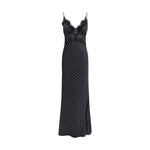 The polka dot satin maxi Dress by Self Portrait takes inspiration from lingerie, combining playful polka dots with sensual lace trims. The fluid silhouette is enhanced by a flowing mermaid hem, while the low-cut back adds a striking and feminine touch. Crafted from slightly stretchy fabric and true to size, the design features a button-down front closure and delicate lace details, making it an elegant statement piece to wear with heels for a confident entrance.