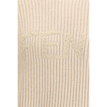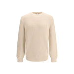 The pullover by Fendi is a regular-fit crew-neck Knit crafted from soft light grey wool yarn, finished in an English rib texture for a refined and structured look. The front is embellished with an oversized Fendi lettering embroidery in a tonal thread, giving the piece a distinctive and modern character.