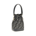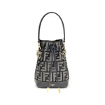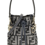 The denim-effect FF jacquard mini Bucket Bag by Fendi has a compact, timeless silhouette with a knotted drawstring finished in metal. Made of calfskin leather, it is lined inside and features gold-tone metal hardware. Equipped with an adjustable and removable handle and shoulder strap, it can be worn hand, shoulder or cross-body.