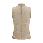 The FF lace Top features a sleeveless design with a high collar and a fitted silhouette. Made of black jersey lace with an all-over iconic FF motif, the piece creates a sophisticated see-through effect. The unlined construction enhances the lightness and boldness of the design, making it a distinctive and statement-making garment.