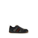 The Screener Sneakers by Gucci are made of two-tone black délavé-effect GG fabric with leather lining for comfort and breathability. The design is enhanced by the green and red Web ribbon, enameled oval detail with metal Double G and vintage Gucci logo label. The rubber sole ensures durability, while the lace-up closure includes an additional pair of laces, completing a style with retro and contemporary appeal.