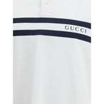 The white stretch Cotton Polo Shirt by Gucci, with a relaxed and comfortable fit, is enhanced by a striped print and the Gucci logo centered on the front, for a modern and distinctive look.