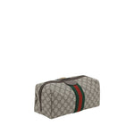 Beauty Case by Gucci, iconic all-over GG supreme print, top zipper closure, green and red web motif on front and back, iconic brand logo applique on front, single interior compartment.