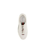 The Shift Sneakers by Gucci feature a low-top design with a lace-up closure, enhanced by a red and green Web tab and back detail. The two-tone rubber sole features the Gucci logo, combining iconic style and functional design.