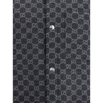 The Wool Jacket by Gucci embodies refined elegance with unique detailing. An all-over GG monogram defines the surface, while the contrasting classic collar breaks the pattern with sophisticated balance. The front fastening is highlighted by silver-toned buttons engraved with the Gucci name, adding a distinctive touch. Traditional sleeves are complemented by a single overlay detail on the left shoulder, lending a contemporary sartorial twist. A single button closure at the cuff completes the design, striking the perfect harmony between tradition and modern style.
