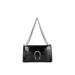 – Composition: 100% calf leather – Lining: Leather – Patent effect – Suede effect microfiber lining – Sliding chain strap – Antique silver-tone metal hardware – Flap with push-lock closure – Flap pocket under the flap – Two internal compartments with central zippered pocket – Length 28 cm, Height 16,5 cm, Width 10 cm, Strap 120 cm – Made in Italy – Gender: WOMEN –