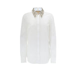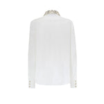 Front fastening with covered buttons, long sleeves, removable classic collar covered with decorated tulle and crystals, Korean collar. Regular fit.