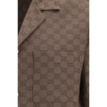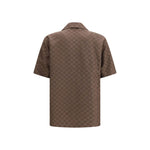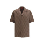 The GG linen blend bowling Shirt by Gucci is a fresh and modern piece, featuring brown fabric with the iconic GG motif. It has a pointed collar and dropped shoulders for a relaxed, contemporary fit. The short sleeves and chest pocket add a touch of functionality, while the matching side slits improve the fit. The button closure completes the design, making it ideal for a casual yet sophisticated look.