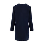 Mid-length dress, round neckline, long sleeves, two side welt pockets, opening on the shoulder with gold Gucci logo buttons. Straight tube line, internal lining