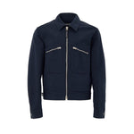 Front zip fastening, slider with leather detail, two front pockets closed with visible zip, two side welt pockets, waistband with buttons on the sides. On the back leather tag applied with tone-on-tone logo.