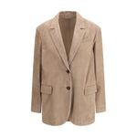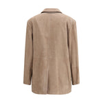 The suede Jacket with monile by Brunello Cucinelli blends refined materials with the brand’s signature sartorial elegance. Its soft, velvety suede enhances the season’s hues with a subtle, matte iridescence, while the single-breasted closure gently defines the waist, creating a distinctly feminine silhouette. Peak lapels and flap pockets nod to classic menswear tailoring, reinterpreted with contemporary finesse. A delicate embroidery of luminous, nickel-free monile an iconic Brunello Cucinelli detail adds a refined, unexpected touch of light to the piece.