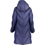 long goose down jacket with hood, zip, 2 external pockets, 2 internal pockets, contrasting details, application, logo