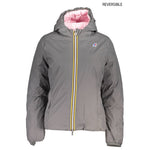 long-sleeved down jacket with hood, double face, 2 external pockets, 2 internal pockets, contrasting details, application, logo