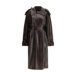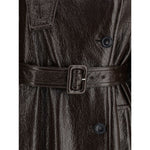 The Bairo long trench Coat by Sportmax reimagines a classic outerwear icon with a modern glossy finish. Crafted from coated brown fabric, it features a shirt collar with throat latch, visible side button closure, and military-inspired details such as shoulder and cuff epaulettes. A covered-buckle belt defines the waist, while the relaxed, fluid silhouette enhances movement, embodying a refined yet confident sense of style.