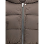 The Hooded Down Jacket by Rick Owens is cropped and cinches at the waist, featuring horizontal quilted padding, a central zip, and a top snap closure. Equipped with welt pockets with buttons, ribbed waistband and cuffs, it is completed by the signature cotton strap with rivet on the back, a distinctive symbol of the brand’s identity.
