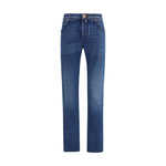 The Nick Ltd Slim Fit 5-Pocket Jeans by Jacob Cohën showcase Italian craftsmanship in an exclusive edition. Featuring a pony hair and Saffiano leather patch, a rose-gold finished Limited Edition metal plaque, and a unique serial number, these jeans embody sophistication and individuality. Details like the flat engraved button, embroidered fly, and the signature printed bandana highlight the brand’s dedication to luxury and authenticity.