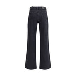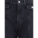 The Lotta wide leg Jeans by 7For feature a high-waisted silhouette that gently hugs the contours of the waist and hips, then opens into a wide, comfortable, full-length leg. The design features a front seam detail that accentuates the structure, while the flap pockets are embellished with elegant gold trim. The closure features a zipper and button, and the back pocket maintains a clean, minimalist design for a modern, sophisticated look.