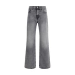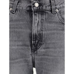 Cotton Korea Jeans by Haikure, denim design, five-pocket straight style, front button and zipper closure, belt loops waistband, iconic branded signature leather patch with press-stamped applique on back, monochrome pattern, regular fit.