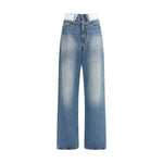 The straight-leg Jeans by MM6 rework classic denim through a subversive, deconstructed detail. The layered waistband creates a doubled effect that reveals raw edges and inner construction, highlighting the brand’s unconventional approach to tailoring. A faded wash and tobacco-colored stitching enhance the lived-in character of the piece, while the signature white stitch line at the back marks it unmistakably as MM6. Designed with a full-length wide-leg fit, the jeans fasten with a front zip and button, balancing conceptual design with everyday wearability.