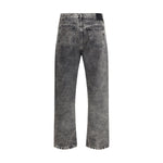 The Pinko five-pocket jeans in black stone-washed denim feature a loose-fit, contrast patches, and small faceted studs, with mid-rise waist, belt loops, and zip and button closure, combining workwear style with contemporary details.