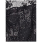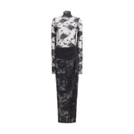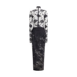The Tessa sheer Lace Jumpsuit by The Andamane is a bold, sensual piece that plays with structure and contrast. Featuring a turtleneck with an open back, it comes with long sleeves and a knotted drape detail at the waist that enhances the silhouette. Hidden beneath the flowing maxi skirt with a dramatic slit are full-length leggings, adding an unexpected modern twist. A button closure secures the turtleneck in place, completing a refined and striking design.