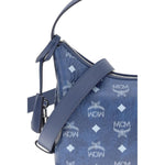 Aren Hobo Shoulder Bag by MCM, adjustable flat shoulder strap, zippered top closure, interior zippered welt pocket, single compartment, hammered weave, iconic brand monogram printed with all-over contrasting pressure print, padlock detail.