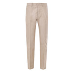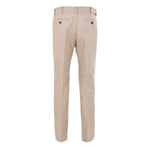 Tom Ford Beige Technical Fabric Chinos. Front fastening with metal hook and covered buttons, two side welt pockets, two back pockets with buttons. Straight fit with center crease on the leg, leather logo tag on the back.