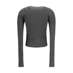 The lurex Cardigan by Amiri is a close-fitting garment with sophisticated lines, made from a ribbed fabric that enhances the figure. The front closure with buttons shaped like the brand’s logo creates a “now you see it, now you don’t” effect, adding an intriguing and sensual touch. The lurex adds shine and brightness to the look, making this cardigan ideal for those seeking a balance between understated elegance and modernity.