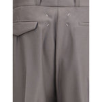 The Margiela Green Wool Trousers with pleats combine elegance and functionality in a contemporary piece. The pleated design enhances the silhouette, while the waistband loops allow for a belt to complete the look. Side pockets add practicality without compromising style, making this model perfect for formal occasions and refined outfits