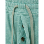 Elastic waist with adjustable drawstring, covered button placket, two side pockets, two back patch pockets. Relaxed fit with cuffs on the bottom.