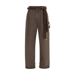 The Lisa Fur Belt Adorned Loose Fit Carpenter Pants by Darkpark offer a bold, modern take on utilitarian design. Crafted from cotton with a relaxed, wide-leg silhouette, they combine ease of wear with refined structure. The piece features belt loops, a zip-and-button closure, front and back pockets, and visible stitching along the hem. Subtle distressing and deliberate frayed cutouts at the lower leg lend an edgy, lived-in feel, while the faux fur belt detail adds a statement twist—balancing workwear functionality with Darkpark’s signature avant-garde flair.