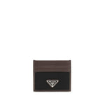 The leather and fabric Card Holder by Prada is a compact and refined accessory made of leather with a contrasting fabric insert that enhances its modern aesthetic. The iconic logoed metal triangle, the Maison’s signature detail, stands out on the front. Functional and well-organized, it offers a slit pocket and six practical card slots, ensuring elegance and everyday convenience.