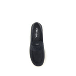 The suede Loafers by Prada are a sophisticated and versatile piece, perfect for those seeking timeless elegance. The round toe and mask give them a classic, refined design, while the laminated logo print on the instep adds a distinctive, modern touch. The logo-printed interior and contrasting sole complete the look, making these loafers not only elegant but also comfortable. Ideal for a chic, refined look, they are perfect for a variety of occasions, from work to casual outings.