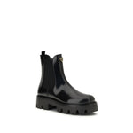 The brushed leather Ankle Boots by Prada combine sophistication with bold character. The upper features elasticated side inserts and a rear pull tab, while the leather lining ensures comfort and artisanal quality. The iconic enameled metal triangle logo enhances the design, completed by a lug sole with tread pattern and a chunky profile that adds structure and personality.