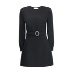Saint Laurent’s mini Dress is an elegant and structured design perfect for special occasions. Made with long sleeves and a round neckline, it features a refined button closure at the back of the neck, as well as a hidden hook-and-eye zipper at the back of the skirt.The silhouette is enhanced by padded shoulders and a diamond-cut nude back for a sensual and sophisticated effect. Completing the look is an adjustable, removable belt embellished with a crystal-encrusted oval buckle, which adds a bright and iconic touch.