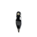 Glossy leather Jeanne Pumps by Saint laurent combine bold elegance with iconic details. Featuring a silhouette with a square neckline and metal toe decorated with the hammered CASSANDRE monogram, they stand out for their refined and recognizable style. The elasticized strap at the back ensures a secure fit, while the stiletto heel slims the figure. The leather sole, round Saint Laurent engraved plaque on the insole and the silver metal CASSANDRE, the house’s distinctive signature, complete the style.