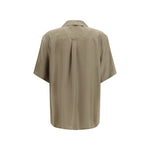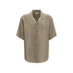 The silk satin Shirt by Saint Laurent with geometric pattern features a distinctive design, with a micro starburst pattern of squares and diamonds that enriches its texture. The short sleeves and boxy fit offer modern comfort, while the French collar and patch pocket on the chest add elegance and functionality. The button closure at the front and straight hem complete the look, perfect for those seeking a refined and contemporary style.