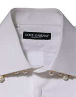 Absolutely stunning, 100% Authentic brand new Dolce & Gabbana white dress shirt, crafted in crisp cotton and adorned with an ornate gold-tone chain and faux pearl detailing. A striking formalwear piece that blends classic tailoring with runway-level flair.