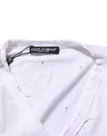 Gorgeous brand new, 100% Authentic Dolce & Gabbana white T-shirt features a distressed finish that adds a modern, worn-in edge. Designed with a classic V-neckline and short sleeves, it combines casual comfort with signature Italian style. A versatile staple that effortlessly elevates everyday looks with a touch of rugged sophistication.