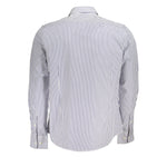 LONG SLEEVED SHIRT, BLUE STRIPED, FRENCH COLLAR, 2 BUTTON CUFFS, BUTTONS, EMBROIDERY, LOGO