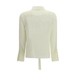 The ruffled Shirt by Alexander McQueen conveys a refined and romantic elegance through bold yet balanced tailoring details. Crafted from chalk-white crêpe de chine, it features a clean band collar that frames the neckline with understated sophistication, while tone-on-tone ruffles along the front add fluidity and visual depth. Long sleeves are finished with oversized cuffs, lending structure and character to the airy silhouette. The front button closure reinforces a classic appeal, while the use of organic silk yarns elevates the piece with a sense of responsible luxury and natural refinement.