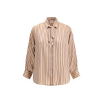 The Yvonne Shirt by Cruna embodies relaxed sophistication through refined design and premium materials. Crafted from striped satin in a viscose and silk blend, it features an oversized silhouette that drapes elegantly. The detachable scarf and metal buttons at the collar and cuffs lend distinctive character, blending femininity with contemporary flair. Ideal for enhancing business looks or transitioning into more casual moments, Yvonne is a versatile expression of effortless elegance.