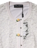 cardigan features a cream lace knit design adorned with charming rose-shaped buttons. Crafted for a soft, comfortable fit, it adds a feminine and sophisticated touch to any outfit. Perfect for layering over dresses or blouses for polished daytime looks or refined evening styling.