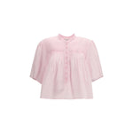 The cotton Shirt by Marant Étoile embodies a romantic and airy style, defined by its pleated design that adds movement and femininity. The round neckline and dropped shoulders create a soft, relaxed silhouette, while the short sleeves complete the look with effortless ease. The front button closure and straight hem finish the piece, making it a versatile option for refined everyday outfits in a solid color.