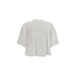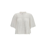 The cotton Shirt by Marant Étoile embodies a romantic and airy style, defined by its pleated design that adds movement and femininity. The round neckline and dropped shoulders create a soft, relaxed silhouette, while the short sleeves complete the look with effortless ease. The front button closure and straight hem finish the piece, making it a versatile option for refined everyday outfits in a solid color.