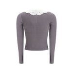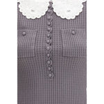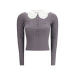 The lace collar knit Top by Self Portrait features a refined grey pointelle knit, enhanced by a contrasting cotton broderie anglaise collar that adds a charming, romantic detail. Designed with a bodycon silhouette, it fits true to size and is crafted from a stretch fabric for comfort and ease of wear. The button-down front completes the look, making it perfect to style with baggy jeans for a modern contrast and an effortlessly chic date-night outfit.