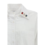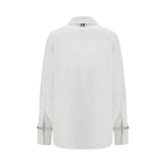 The cotton Shirt by Thom Browne is a garment that blends classic and modern with distinctive details. A classic collar and button closure define its sleek, clean design, while a patch pocket on the front adds a functional touch. The logo patch on the chest is an iconic detail that recalls the brand’s identity. The asymmetrical hemline gives a more dynamic silhouette, while colored stones sewn on the sleeves and collar introduce an element of luxury and originality.