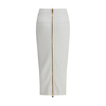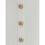 Balmain’s midi Skirt enhances the silhouette with a ribbed and twisted knit, giving structure and movement to the garment. On the front, the characteristic decorative "Coin" buttons in gold metal, the house’s iconic signature, stand out. The back closure is entrusted to an exposed double zipper in gold metal, with sliders engraved "Balmain Paris." Contrasting ribbed trim completes the design for a sophisticated and recognizable look.